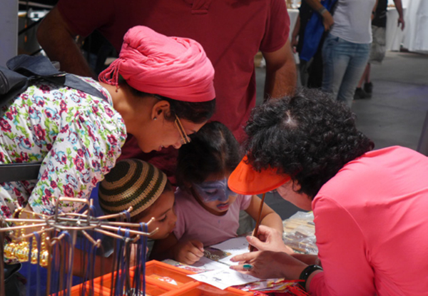中国民协连续多年派团参加以色列国际艺术和手工艺博览会。图为艺术家为以色列小朋友题写中文名字。