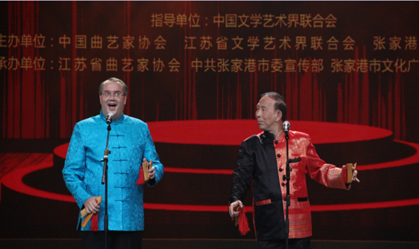 2018年11月,由中国曲协主办的第 6 届国际幽默艺术周在江苏省张家港市举办。图为德国青年相声演员柏仁睿与中国搭档表演数来宝《内当家》。