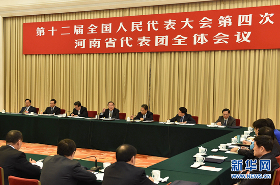 3月8日,中共中央政治局常委、全国政协主席俞正声参加十二届全国人大四次会议河南代表团的审议。 新华社记者 高洁 摄