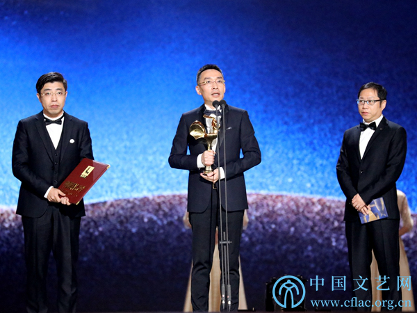 11月23日,第32届中国电影金鸡奖颁奖典礼暨第28届中国金鸡百花电影节闭幕式在福建厦门举行。图为最佳录音王丹戎、祝岩峰、刘 旭(《流浪地球》)发表获奖感言。