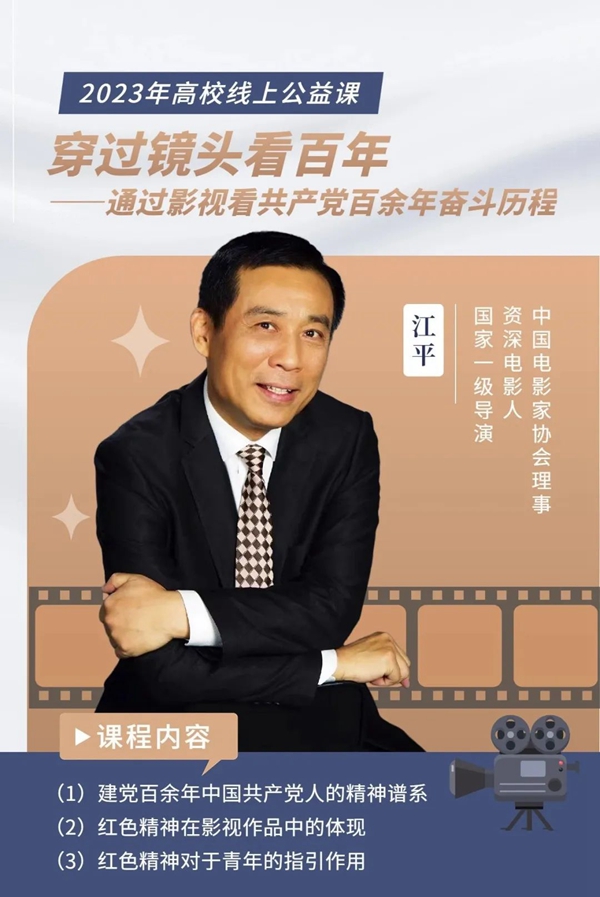 此次线上公益课程,旨在深入学习贯彻落实党的二十大精神,传承中华优秀传统文化,助力提升国家文化软实力和中华文化影响力,增强实现中华民族伟大复兴的精神力量,让网络文艺助推高校青年文化自信自强。课程围绕“穿过镜头看百年——通过影视看共产党百余年奋斗历程”这个主题,邀请中国电影家协会理事、中国电影集团国家一级导演、“全国十佳电视制片人”江平为学生们授课。