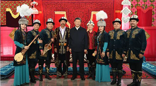 2022年7月13日上午,习近平总书记在新疆乌鲁木齐市新疆维吾尔自治区博物馆,同《玛纳斯》非物质文化遗产传承人在一起。新华社记者 谢环驰 摄