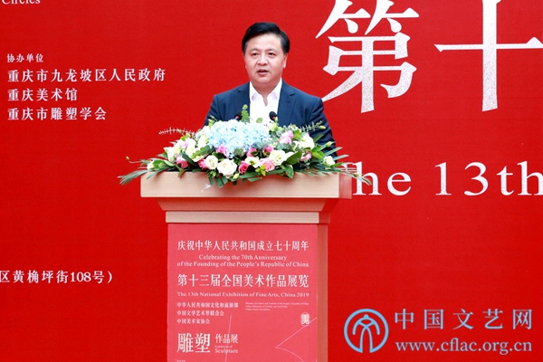 9月25日,“第十三届全国美术作品展览雕塑作品展”在重庆开幕。图为中共重庆市委宣传部副部长张洪斌致辞。中国文艺网 韩雪竹摄