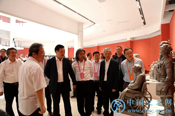 9月25日,“第十三届全国美术作品展览雕塑作品展”在重庆开幕。图为领导嘉宾参观展览。中国文艺网 韩雪竹摄