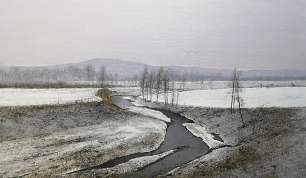 陆庆龙风景画显然倾向于“如画”的设计。但是需要指出的是,如果观者简单地使用“如画”这个概念观看他的新作时,那么观者的感受与理解需要不断地修正这个概念,甚至加以改造这个西方“如画”的概念所指称的审美情绪与情感。譬如画面出现的当代趣味,沉静与纤尘不染的气质,诗与远方的情绪,更加符合中国文化特有诗意与禅意。陆庆龙的作品总体方向是明朗的,即通过描绘熟悉的家乡风景和一些写生风景,如淮北田园、江北雪景、西北山区和高原地貌等。画家在画面上进行了精心的设计,天与水的作为留白的暗示,构图的抽象性,强调线性框架,轮廓的清晰性与质感的丰富性,心平气和气的精密感,画面整体作品对视觉真实的追求,但是这个真实是理想空间的逼真幻象,其空间的静止感、纯净波澜不起,展现出空灵而梦幻的一面。作者对光的精微的洞察力与处理功夫,显示出作者内心深处对于乡土风景所象征的理想与思想的追求。