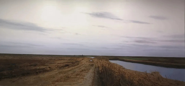 画家有的作品中构图分成三块,一般是宁静的水系或者田间的土路、田野耕地、绷紧的凝练天色。水系是一河两岸或一河三岸,或者一条土路分开田野耕地,这是一种三段式的布局。在元人倪瓒作品其构图形式最早出现“一河两岸”,中间运用大量留白,以天、湖水为白,把近景和远山隔开,且距离拉长,形成平远的效果。如果比较其观察视点的话,三段式在中国画的平远布局有优势。写实油画的定点透视处理,在深远布局有优势。但是焦点透视前后会有所遮挡。所以,陆庆龙在油画风景三段式进行了平面分割,他的目的是如何吸纳中国画的一些布局,尽量平面化,特别是对深远的改造,强调田间路和水系深入远方的透视,以及它们在分割画面时的位置都做了精心考虑。譬如2023年创作的《故乡小河系列》《温情的大地》《苏北大地》等系列作品,画家利用水系与道路作为分割画面重要因素,显然对中外山水和风景作品有所借鉴。