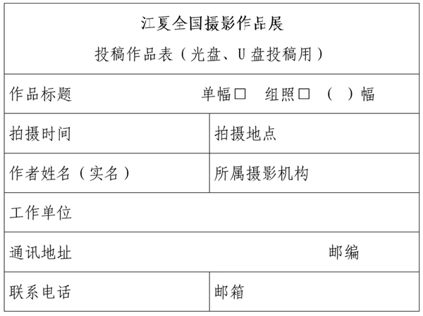 投稿作品以光盘(CD-R或DVD-R)、U盘存储形式邮寄至:北京市东城区东四十二条48号 中国摄影报社活动项目部“江夏全国摄影作品展”办公室收(100007)投稿热线:010-65251661。