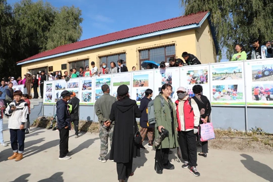 村民们聚集在作品展墙后方的台阶上,吸引了文艺志愿服务小分队的目光,摄影家们纷纷举起手中的相机即兴创作。