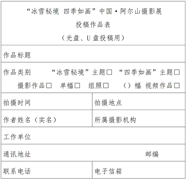 投稿作品以光盘(CD-R或DVD-R)、U盘存储形式邮寄至:北京市东城区东四十二条48号 中国摄影报社活动项目部“阿尔山摄影展”办公室收(100007)