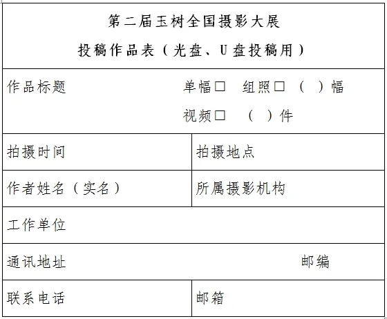 投稿作品以光盘(CD-R或DVD-R)、U盘存储形式邮寄至:北京市东城区东四十二条48号 中国摄影报社活动项目部“第二届玉树全国摄影大展”办公室收(100007)