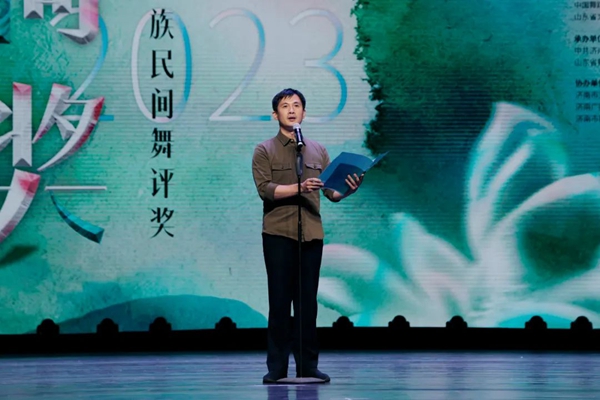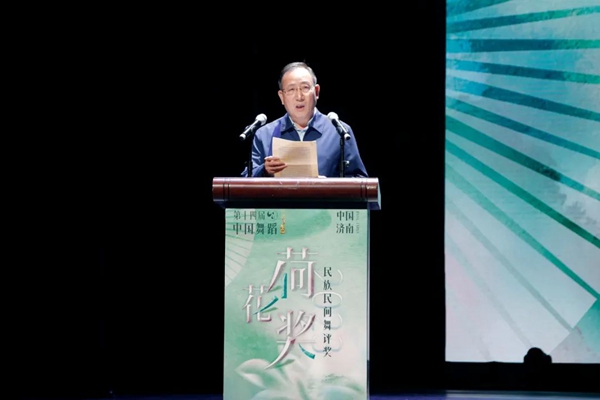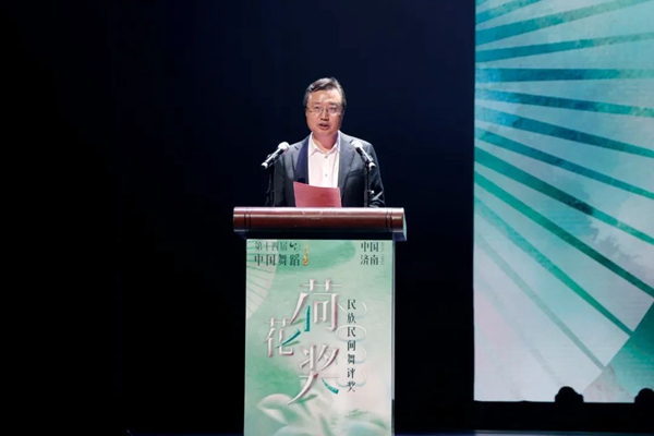 山东省文联党组书记、副主席何思清主持第十四届中国舞蹈“荷花奖”民族民间舞评奖终评开幕式。