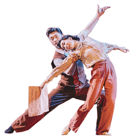 虽然上述《卡门》之“舞”已然预示了舞剧戏剧冲突的走向,但观众更直接感受到的是安娥不断抓拍剧照、包参事时常流露不屑的哑剧表演。历史的真实是:新剧《卡门》的公演是田汉创作意旨的重大转折,也即此后田汉有了自觉的“阶级意识”。用田汉自己的话来说,是“藉外国故事来发挥革命感情影响中国现实”。该剧塑造的“自由的卡门”成为一个为团体、为阶级争自由的形象,因此首演后即遭禁演,演出该剧的“南国社”不久也遭查封。这意味着舞剧《热血当歌》一开场便揭开了尖锐的矛盾冲突,在舞剧的可观赏性中蕴藉着戏剧的强冲突性。当然,以新剧《卡门》演出的“戏中戏”开场,还有个重要的戏剧任务是纠葛男女首席舞者的人物关系。编剧为此后写下的文字是:“安娥将拍下的剧照交给田汉,一起热情地谈论起新剧《卡门》;艺术的话题令两人惺惺相惜,在优美的夜色中怦然心动……”舞台上,编导纠葛或者说是深化这一戏剧任务的,是田汉与安娥的两段“双人舞”:先是在田汉的工作室内,也即两人谈论新剧《卡门》引发的“共情”;编导借助室内工作台的特定环境,设计了具有特殊扶举、托举动态的双人舞,甚至还借助田汉放在椅背的西服来做双人舞中的某种介质。这之后田汉与安娥挥别,“暗转”后的双人舞意味着再一次约会——场景由室内转到室外,从八位舞者两两一组推着四柱路灯作为衬舞兼衬景来看,田汉与安娥的这段双人舞是在夜间的街头漫步。也就是说,这段双人舞以“行走”为主,时而是优雅的交谈,时而是温馨的牵手,时而是喜兴的雀跃,时而是恣意的追逐——这其中“恣意的追逐”不仅意味着两人不断升温的“共情”,而且编导导入了一种独特的动态表现:田汉与安娥的“追逐”其实是原地抬脚奔跑,通过“路灯”以及推灯舞者的“倒行逆施”、渐退渐远来造成双人舞原地“追逐”的错觉……