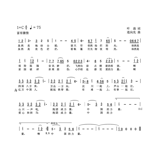 4月20日,四川芦山发生7.0级强烈地震。当灾难再度来袭时,四川诗人叶浪感同身受,创作了一首歌词《中国力量》。经过广东音乐人连向先谱曲,歌唱家廖昌永的演唱,四川芦山“4·20”抗震救灾公益歌曲《中国力量》诞生。《中国力量》已于日前录制完毕,并将于5月上旬向社会公众推出。
