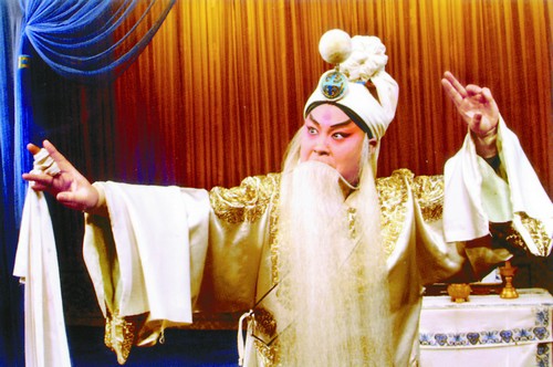《杀驿》是讲驿官吴承恩曾在王史官王彦丞府中为仆,王被奸臣所害发配,解至芦洲驿,吴承恩决心替主代死。此剧运用不少技巧功。比如,当他得知王大人将在天亮前就要被就地正法时,我用跌倒、颤抖、抖须、挑须、甩须、左右摆须等连贯的技巧,表现吴承恩极度恐慌的神情;当唱到“我正想设法将他救,谁料想大祸燃眉头”时,我运用单闪翅、双闪翅,舞动水袖和胡须等技巧,表现吴承恩左思右想也无搭救良方;当我表现吴承恩假冒王彦丞,递刀给京解求死,并在【摩锤】中,双腿后磋步……左手握梢子,右手反抓须,噙须,右转身大跳跪地、甩发,同时向京解拱手叩头,在【三锤】中,挽梢子、抹眉拉眼、亮脖、背双手亮相,表现人物杀身成仁、义无反顾的决心。此剧是王保易、马世中老师传授。