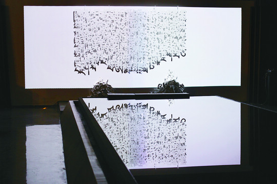 《智·结》是意大利艺术家鲁迪(Rudy Pulcinelli)借由装置艺术这种现代艺术形式对古老神秘的藏文化的一种意向化表达。这件作品的创作意向来自于藏文化中最具特色的3个文化载体——藏文、经幡和玛尼堆。藏文寓意冥想的符号,是与神灵和自然沟通的媒介;经幡是福运升腾的象征,是文化的物化;白色的藏文符号一部分浮展于墙体上,一部分则延伸到地面,堆叠成玛尼堆的造型。