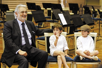7月14日,西班牙男高音多明戈和两个孙子出现在马德里皇家歌剧院《邮差》的排练现场。图/IC