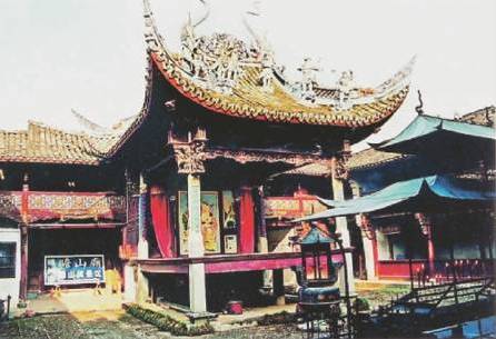 后来有条件到全国各地行走,日益领略了南方戏台的琳琅满目与斗彩争艳。与北方的厚重宏阔不同,南方戏台通常精巧灵动,屋檐愈加反翘飞升、装饰重累,台身愈加雕造夸饰、金裹银敷,台基也由北方的砖石垒砌改为柱撑架空的干阑式结构。许多顶部采用复杂华丽的累檐飞脊形式,内部则是重重叠叠的藻井结构,个个争奇斗艳、彼此称胜。戏台各处往往镶嵌众多的砖、石、木雕图案,镂空雕刻众多仙侣人物、亭台楼阁、山水花鸟、祥禽瑞兽,显现了高精的雕造工艺和追巧的审美趋势。福建、广东的戏台更是敷粉彩、镶金饰、贴陶砖、堆灰塑,把个戏台层层累累堆积做销金窟,这种风格影响了港澳台地区甚至整个东南亚。其他如牌匾的精致讲究,楹联的奇巧工稳,书法艺术的极度弘扬,都成为古戏台的看点,引你流连忘返。北方人到此往往会被其金玉富贵的氛围所裹胁,强烈感受到民风的浮华艳丽。南方也见到更多戏台的类型,水畔戏台、桥上戏台、宗祠戏台等,走在江南大地上,时时会有着惊喜的发现。至于临时用蓬席搭建的戏台,以往年节时一定城乡比比皆是,今天反映在许多明清绘画里,我也搜集了许多例证。