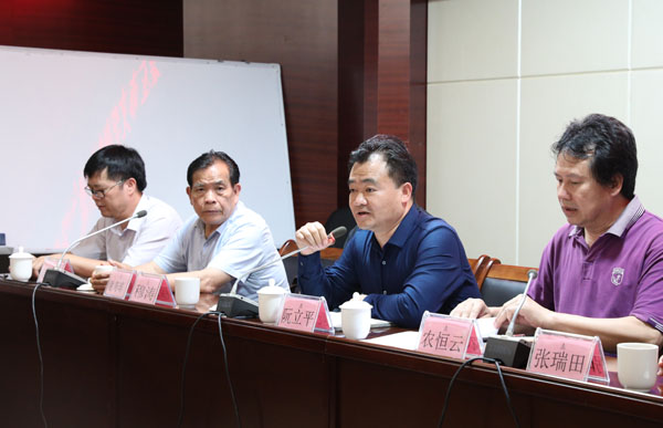 图为中共崇左市宣传部常务副部长阮立平(右二)在笔会上鼓励崇左本土作家多创作文学精品
