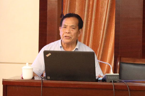 图为著名民族文化学者、广西骆越文化研究会会长谢寿球为崇左作家学员授课