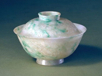 翠质浅绿色。碗为薄胎,口外敞,盖略小,地包天式,环式钮。盖面及碗外壁浅浮雕缠枝莲纹。