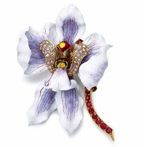 蒂芙尼传奇设计师波尔丁·法汉姆(Paulding Farnham)(1859–1927)共创作了二十四枚珐琅兰花胸针,这些清雅别致的非凡之作曾在1889年的巴黎世界博览会上展出,并被赞誉为参展作品中最具原创性、最卓尔不凡的珠宝杰作。这枚胸针清新纯美的外形源自一朵产于菲律宾山区的异域兰花,经由淡紫色、红色和白色珐琅搭配20k黄金、钻石和红宝石,生动巧妙地诠释出兰花高贵优雅的神韵。