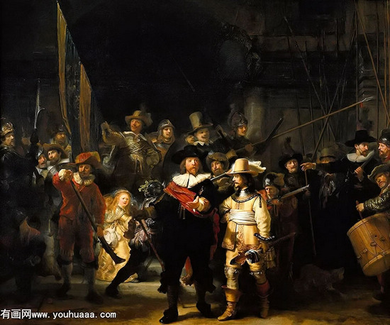 《夜巡》是伦勃朗最著名也是最引起争议的一幅作品。创作于1642年,像《夜巡》这样的集体肖像画,在当时的荷兰绘画中占有相当重要的地位。但是伦勃朗早就对这种陈旧俗套的标示方式感到不满,因此,他接受订画时,就决心不把所有的人物都平等的排列在画面上,而尝试新的集体肖像画创作。