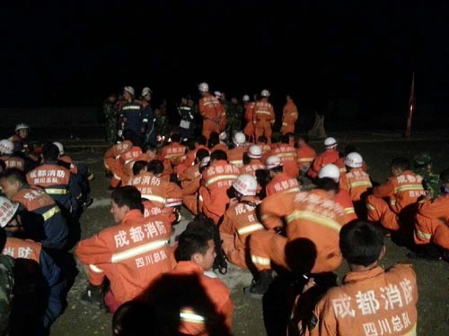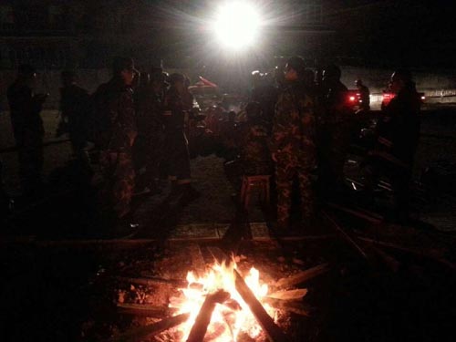 龙门乡山村破坏厉害,路窄展不开救援。直升飞机在天上繁忙飞行,武警、部队、空军、成都民兵都到了很多,在等待分配具体地点分头救援。龙门乡停电,移动无信号。我的手机终于在应急保障车上充了一阵电后,分到方便面。我朋友摄影家曹铁今天配合央视军事频道也来灾区。我们在县政府花台边坐了一阵,他们总算特殊,搞到一顶军用帐篷。要知道,今天很多媒体和救援人员可能只能露宿。
