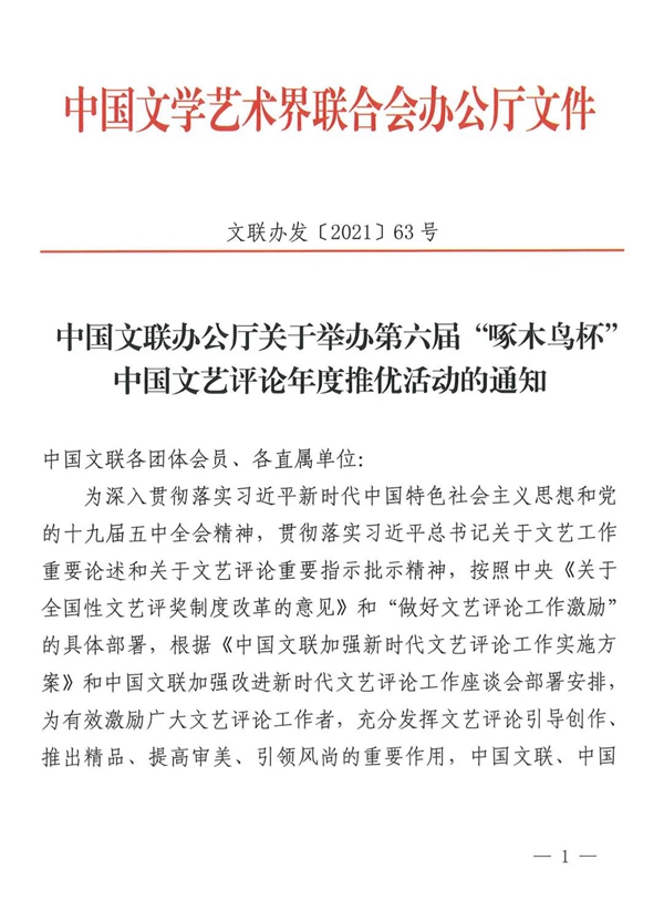 为深入贯彻落实习近平新时代中国特色社会主义思想和党的十九届五中全会精神,贯彻落实习近平总书记关于文艺工作重要论述和关于文艺评论重要指示批示精神,按照中央《关于全国性文艺评奖制度改革的意见》和“做好文艺评论工作激励”的具体部署,根据《半岛公司官方网站入口查询加强新时代文艺评论工作实施方案》和半岛公司官方网站入口查询加强改进新时代文艺评论工作座谈会部署安排,为有效激励广大文艺评论工作者,充分发挥文艺评论引导创作、推出精品、提高审美、引领风尚的重要作用,半岛公司官方网站入口查询、中国文艺评论家协会决定举办第六届“啄木鸟杯”中国文艺评论年度推优活动。具体事项通知如下: