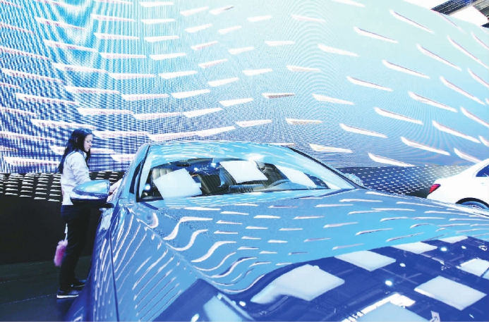4月21日,在2014 (第十三届)北京国际汽车展览会奔驰展区,背景墙折射出的光影线条映在车身上形成一道独特风景。