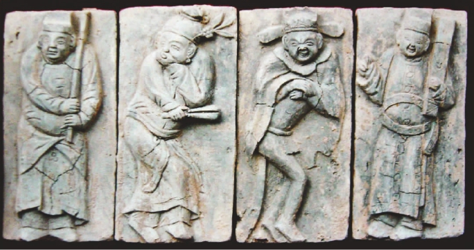 靖康之难后,此类墓葬在黄河南岸潜迹,代之而起的是金代在山西南部的集中兴起。金世宗大定年间,金立国已五代,又经过几十年的经济文化发展,民间渐渐医治了战争的疮痍,山西一带民间生活便日渐繁盛起来,戏曲演出也重新开始繁荣。相较于宋代来说,金墓中的戏曲砖雕更加普遍,通常为模制,说明民间有专门的烧造作坊进行批量生产,以供应修砌墓葬的不时之需。从雕造工艺来看,宋代戏曲砖雕多是依据画范进行平面浅浮雕,即于略凸出于浅地的人物像上做阴线剔刻,而其构图基本上还是在绘画的基础上进行加工的,汴京宫廷画院和当时民间的大量画士、画工的作品可能是其画范的来源。金代晋南地区已经没有那种画工云集的条件,戏曲砖雕主要是雕造工匠们的创作,技法改为半圆和全圆雕,然而演员造型、情态、气质诸方面更加生动传神,展示了砖雕匠人工艺技术的极大进步。金代墓葬中戏曲砖雕的普及、工艺的定型化和雕造技巧的提高等特点,应是民间需求量增加所刺激的结果。