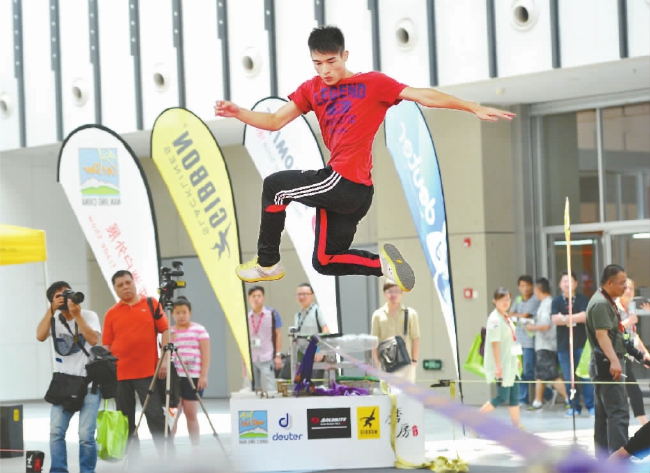 7月24日, 2013 (第八届)亚洲户外用品展览会现场,许多户外运动爱好者表演走扁带,他们在一根只有5厘米宽的尼龙带上做出跳跃、转体、空翻等各种花式,犹如在跳一支优美的“舞蹈” 。图为户外运动爱好者在表演走扁带。
