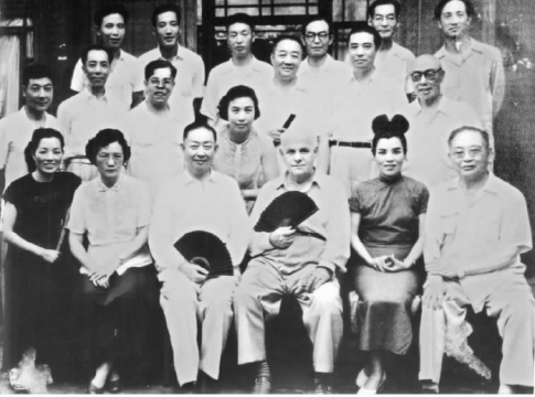 1963年北京人艺上演田汉的《关汉卿》 ,梅兰芳等人应邀前来观看,随后大家一起相聚梅兰芳家中并合影留念。前排左三梅兰芳,右三苏联戏剧专家波波夫,右二舒绣文,右一欧阳予倩,中排右一田汉,右二孙维世,后排右一欧阳山尊,右二焦菊隐。