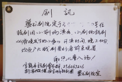 宝鸡市话剧团的演出信息就写在这样的宣传板上。由于经费紧张,他们没有钱去印制节目单和宣传海报。