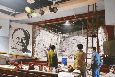 报纸糊墙,是“宝话”版《一个无政府主义者的意外死亡》的布景。首先是为了节省成本,不过冯子夏说,这个布景也有一定的艺术表现用意,他告诉记者,孟京辉版的这部话剧,布景材料用的是玻璃钢瓦、白铁皮。