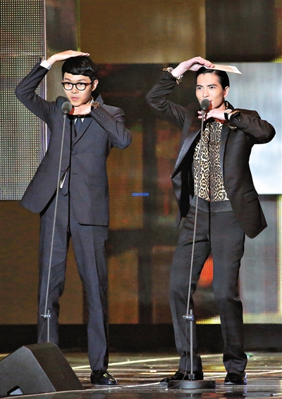 “雨神”萧敬腾从蔡依林和周杰伦手中接过最佳国语男歌手的奖杯,最近事业顺风顺水的萧敬腾在台上大喊“超爽”。