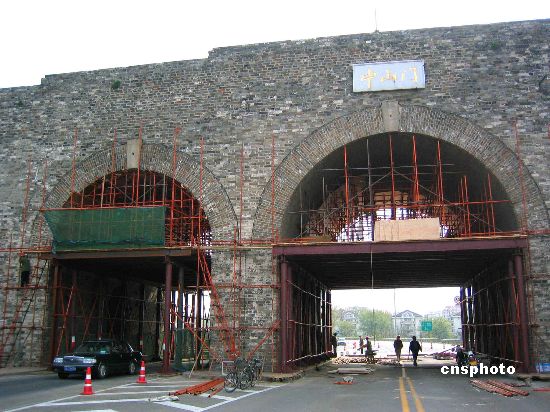 资料图:建于明代的南京中山门城墙,经历几百年的风雨,加上作为沪宁高速公路南京的入口出,墙体部分出现了开裂现象,为了保护明城墙,南京市开始对南京中山门城墙进行维护,对其进行加固。