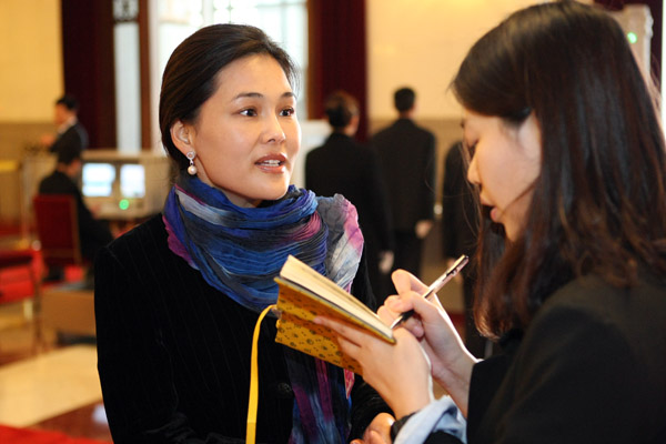 3月3日,参加政协会议的邱丽霞接受记者采访。新华网/中国政府网 记者杨理光摄