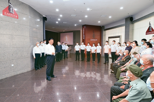 2022年8月16日至17日,中共中央总书记、国家主席、中央军委主席习近平在辽宁考察。这是16日下午,习近平在锦州市考察辽沈战役纪念馆时,亲切会见老战士老同志和革命烈士亲属代表。新华社记者 鞠鹏/摄