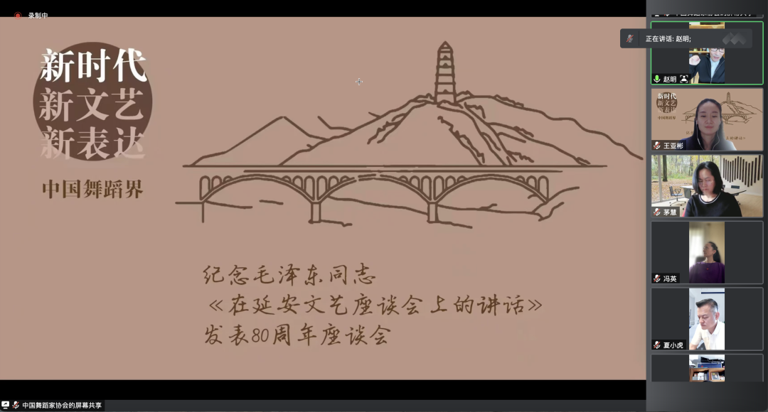 会上,黄豆豆、赵明、王亚彬、茅慧、胡玉婷、王舸、郭磊、赵铁春、冯英、罗斌先后发言,在重温领悟《讲话》及习近平总书记关于文艺工作重要指示精神的同时,从舞蹈创作、表演、教育、理论研究等不同视角,结合具体实践和舞蹈界实际,围绕“延安文艺传统与新时代中国舞蹈的拓新”“艺术的人民性与新时代中国舞蹈观的确立”“新时代中国舞蹈的方向与道路”等议题展开深入交流。
