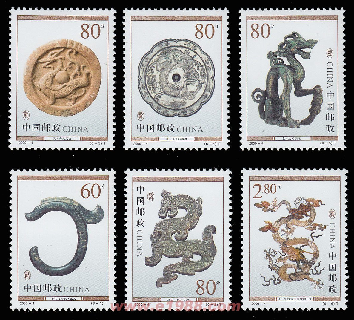 2000年国家邮政局特发行的《龙(文物)》邮票,1套6枚。