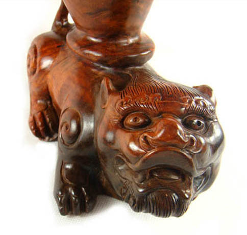 狻猊,形似狮子,排行第五,平生喜静不喜动,好坐,又喜欢烟火,囚此佛座上和香炉上的脚部装饰就是它的遗像。相传这种佛座上装饰的狻猊是随着佛教在汉代由印度人传入中国的,至南北朝时期,我国的佛教艺术上已普遍使用,这种造型经过我国民间艺人的创造,使其具有中国的传统气派,后来成了龙子的老五,它布置的地方多是在结跏趺坐或交脚而坐的佛菩萨像前。明清之际的石狮或铜狮颈下项圈中间的龙形装饰物也是狻猊的形象,它使守卫大门的中国传统门狮更为睁崃威武。