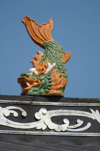 螭吻,又名鸱尾、鸱吻,龙形的吞脊兽,是老九,口阔噪粗,平生好吞,殿脊两端的卷尾龙头是其遗像。《太平御览》有如下记述:“唐会要目,汉相梁殿灾后,越巫言,‘海中有鱼虬,尾似鸱,激浪即降雨’遂作其像于尾,以厌火祥。”文中所说的“巫”是方士之流,“鱼虬”则是螭吻的前身。螭吻属水性,用它作镇邪之物以避火。