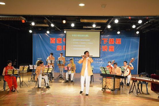 启动仪式后,广东省文联副主席、广东省音协副主席、广东民族乐团团长,国家一级演奏员陈佐辉作了题为《民族音乐鉴赏》专场讲座,为“百家千场艺术讲座下基层”拉开序幕。陈佐辉重点介绍了岭南民乐的传承与发展,讲课形式生动活泼、诙谐幽默,他一边讲解一边请广东民族乐团的部分青年演员作各类民乐乐器演奏示范及经典民乐演奏。欢快的音符似从乐手们的指间流出,现场沸腾起来,场内掌声如潮。参加活动的观众表示,这种套餐形式的讲座带给观众享受与快乐,既高雅又亲民,非常幸运在家门口就能得到如此高质量的文化惠民服务。