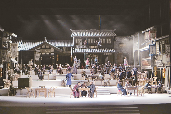随着第三声钟响,灯光渐熄,大幕徐徐开启。与北京人艺版《茶馆》不同的是,四川话版《茶馆》以倒叙方式入手,老年的王利发、常四爷、秦二爷拄着拐杖,踏着蹒跚的脚步出场,北京人艺版最经典的一幕“仨老头撒纸钱”的部分被挪到了戏的序幕,这也令人大吃一惊。而大幕一拉开,便引得台下观众发出了赞叹,似山城码头层层叠叠的阶梯式舞台摆起了龙门阵,热气腾腾的市井气息扑面而来,随后麻辣烫般味道十足的叫卖声此起彼伏,手巾板儿满天飞,春熙路生意兴隆的大茶馆中上演着悲欢离合,立刻让人充满期待。
