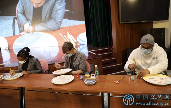 11月10日,2021“今日中国”艺术周的重要板块“传承之路”中国清代陶瓷纹饰艺术展启动仪式在京举办。图为海外留学生现场进行陶瓷纹饰艺术的绘制表演。
