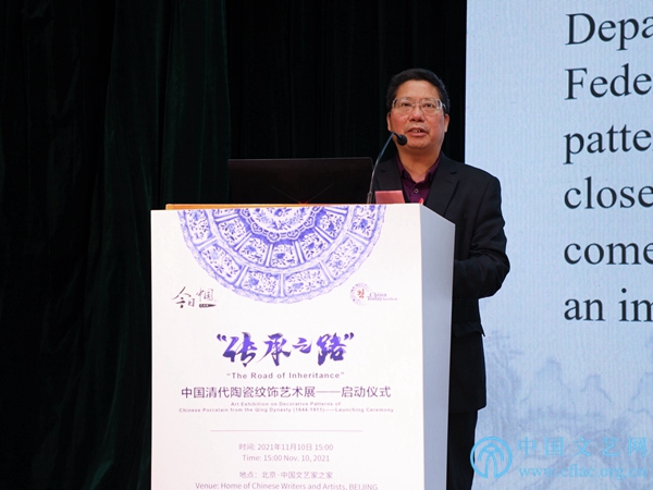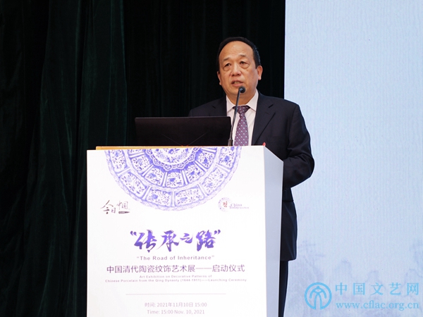 11月10日,2021“今日中国”艺术周的重要板块“传承之路”中国清代陶瓷纹饰艺术展启动仪式在京举办。图为半岛公司官方网站入口查询国际联络部主任董占顺致辞。