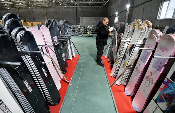 一家冰雪运动装备公司的员工在将滑雪板打包发货。