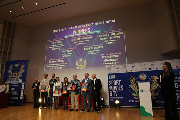 第42届米兰国际体育电影电视节总决赛于11月5日至11月9日在意大利米兰举行。11月9日晚,总决赛颁奖典礼在米兰伦巴第大区礼堂举行,近600名来自世界各国的体育电影工作者齐聚一堂,共同庆祝各奖项的揭晓。由北京国际体育电影周推选的中国体育影片《嗨,亚运——她们》《看不见的顶峰》获得金花环大奖,《屋顶足球》《空手道的起源》获得提名奖。北京奥运城市发展促进会副秘书长王琨、北京奥运城市发展促进中心发展研究部副部长李海红作为片方代表领取金花环大奖。