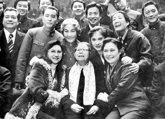 图一:邓颖超应邀出席《诗刊》社为庆祝文代会举办的诗歌朗诵演唱晚会。演员表演结束后,争相与她合影留念。左起:前排夏梦、邓颖超、白杨,二排温可铮、王铁成、张瑞芳、李光羲、秦怡、朱琳、孙道临
