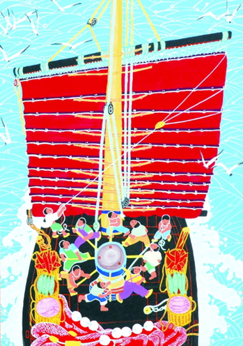 50岁的傅承峰是土生土长的日照渔民,从小就痴迷画画。由于年龄的原因,他现在已经不再下海,而是整日研究绘画。“我十几岁就下海,在海上没有别的娱乐项目,只能画画,画自己熟悉的生活。”傅承峰创作的《大蓬歌》在上世纪80年代中国首次农民画书画大赛中获三等奖。这幅画色彩对比强烈,蓝蓝的海,大红的帆,海鸥绕桅杆飞翔,船上的渔民正奋力向上拉着桅杆,画面表现了渔民奋发向上的精神。傅承峰对记者说:“没有深厚的生活阅历,根本画不出农民画。”